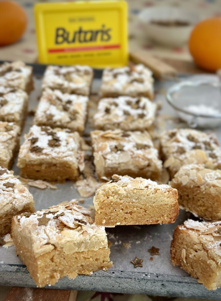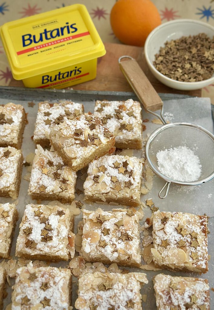 Eigentlich besteht dieser leckere Blondie aus drei Schichten: Der Grundteig, der mit frischem Orangenabrieb aromatisiert ist, gefolgt von einer schönen Mandelcreme – getoppt mit einer Ladung Crunch in Form von gehobelten Mandeln. Durch das Backen erhalten diese die gewünschte Konsistenz.
