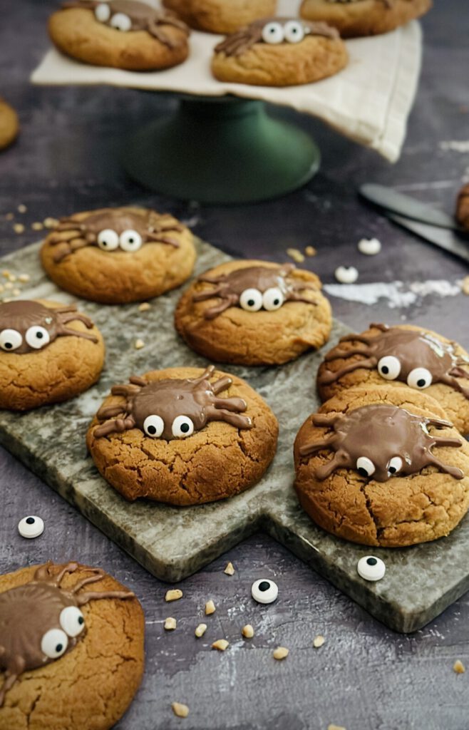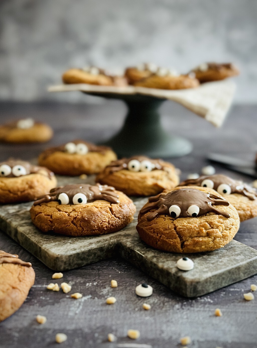- Cookies auf den Blechen leicht abkühlen lassen und nach 10 Minuten jeweils ein Peanut Butter Cup in die Keksmitte drücken und immer 2 Zuckeraugen in die leicht geschmolzene Schokolade setzen